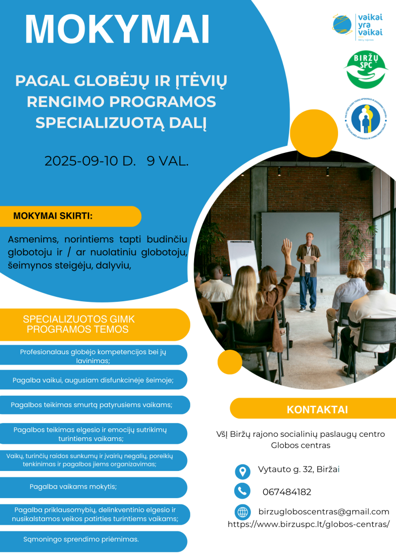 2025 m. rugsėjo 10 d. VšĮ Biržų rajono socialinių paslaugų centro Globos centras pradėjo vesti mokymus pagal globėjų ir įtėvių rengimo programos Specializuotą dalį.